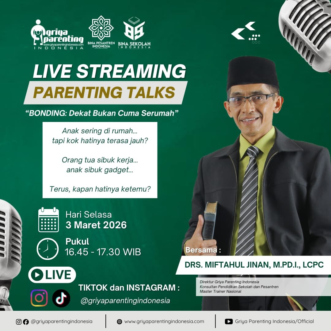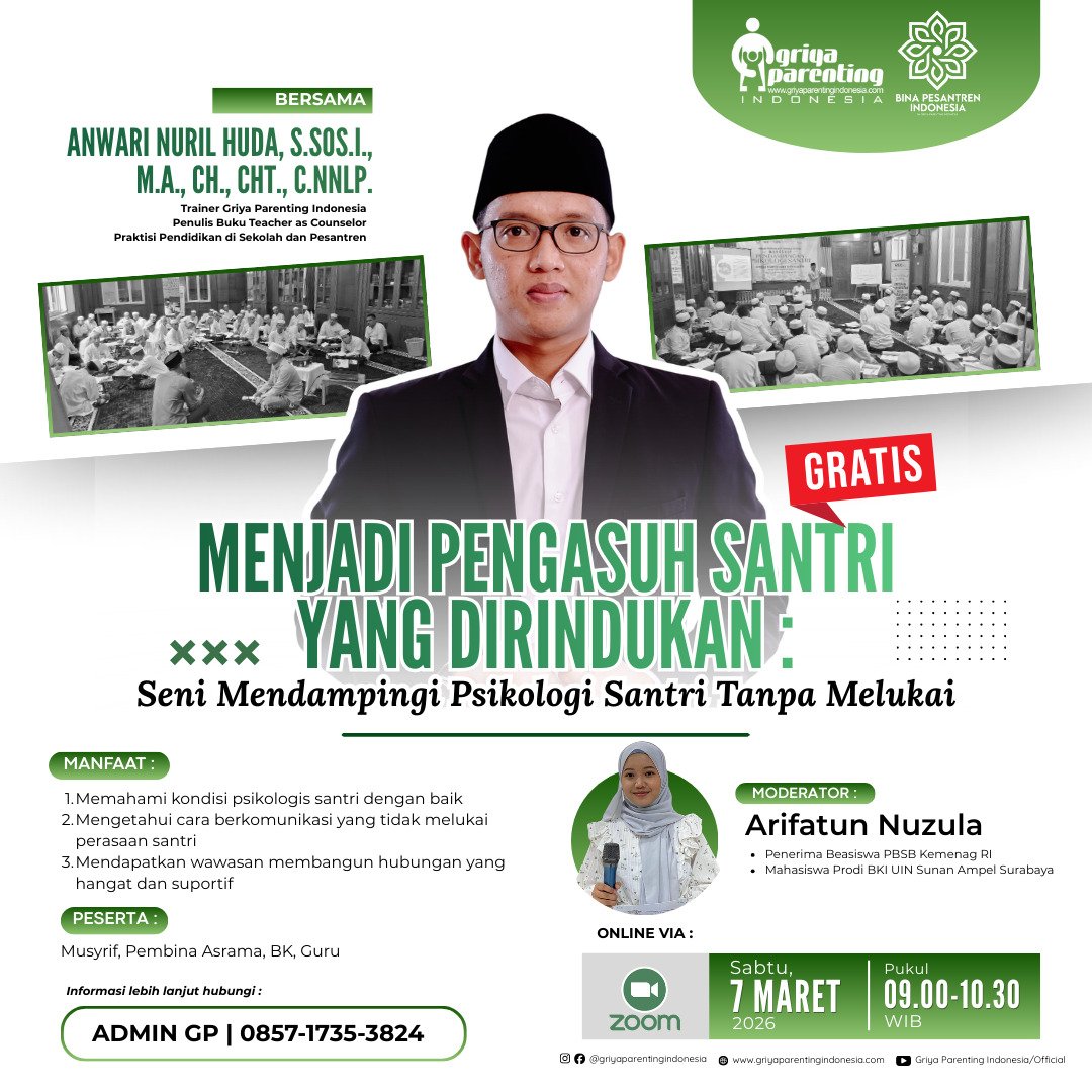 Griya Parenting Indonesia Perum. Griya Taman Cipta Karya Jl. Dahlia E-164, Bohar, Taman, Sidoarjo, SidoarjoSeni Mendampingi Psikologi Santri Tanpa Melukai ✨ Temukan cara mendampingi santri dengan empati, komunikasi yang bijak, dan hubungan yang hangat tanpa menyakiti perasaan mereka. 🗓 Sabtu, 7 Maret 2026 🕘 09.00–10.30 WIB 👤 Narasumber: Anwari Nuril Huda, S.Sos.I., M.A., CH., CHt., C.NNLP. - Trainer Griya Parenting Indonesia - Penulis Buku Teacher as Counselor - Praktisi […]