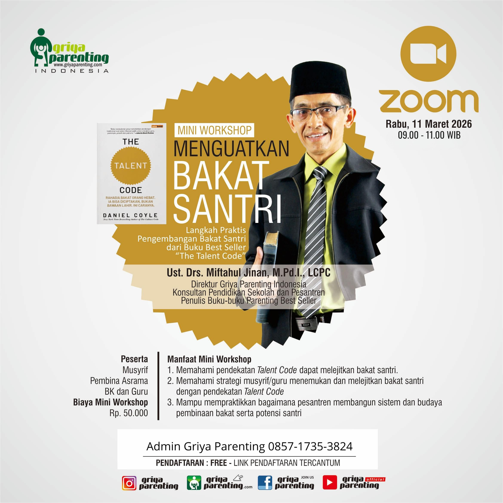 Griya Parenting Indonesia Perum. Griya Taman Cipta Karya Jl. Dahlia E-164, Bohar, Taman, Sidoarjo, SidoarjoLangkah Praktis pengembangan bakat santri dari Buku best seller “The Talent Code” Setiap santri punya bakat. Tapi… sudahkah kita melejitkannya dengan cara yang tepat? Terinspirasi dari buku best seller The Talent Code karya Daniel Coyle, webinar ini akan membahas cara praktis menemukan, melatih, dan membangun sistem pembinaan bakat santri di pesantren. 🗓 Rabu, 11 Maret […]